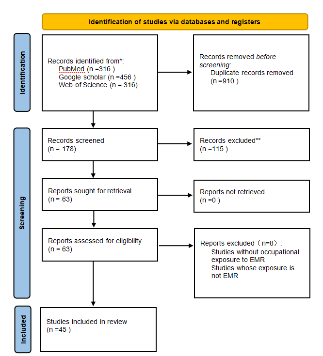 We developed this systematic review according to the Preferred Reporting Items for Systematic Reviews and Meta-Analyses (PRISMA) recommendations. The search was performed using three different databases: PubMed, Google Scholar and Web of Science. To identify the publications eligible for inclusion we used the keywords “Electromagnetic radiation”; “Offspring”; “Nerve”; “Reproductive system” in the following search query: ((“electromagnetic radiation” AND “offspring” AND “parents”) AND “health”).Moreover, to limit the results, we applied the following research filters: articles published from 1 January 1990 to 1 August 2024, exclusion of animal studies and inclusion of publications in English only. As shown in Figure 1, an initial screening identified 70 candidate articles. After eliminating duplications, the initial screening of the studies was performed using information available in both the titles and the abstracts and 63 potentially relevant articles were retrieved in full text and assessed for eligibility according to the following inclusion criteria:Inclusion of both human and anima as study subject, with inclusion of offspring;Assessment of EMF exposure in parents;Inclusion of offspring health risks (For example, reproductive system damage, neurological damage, etc.)