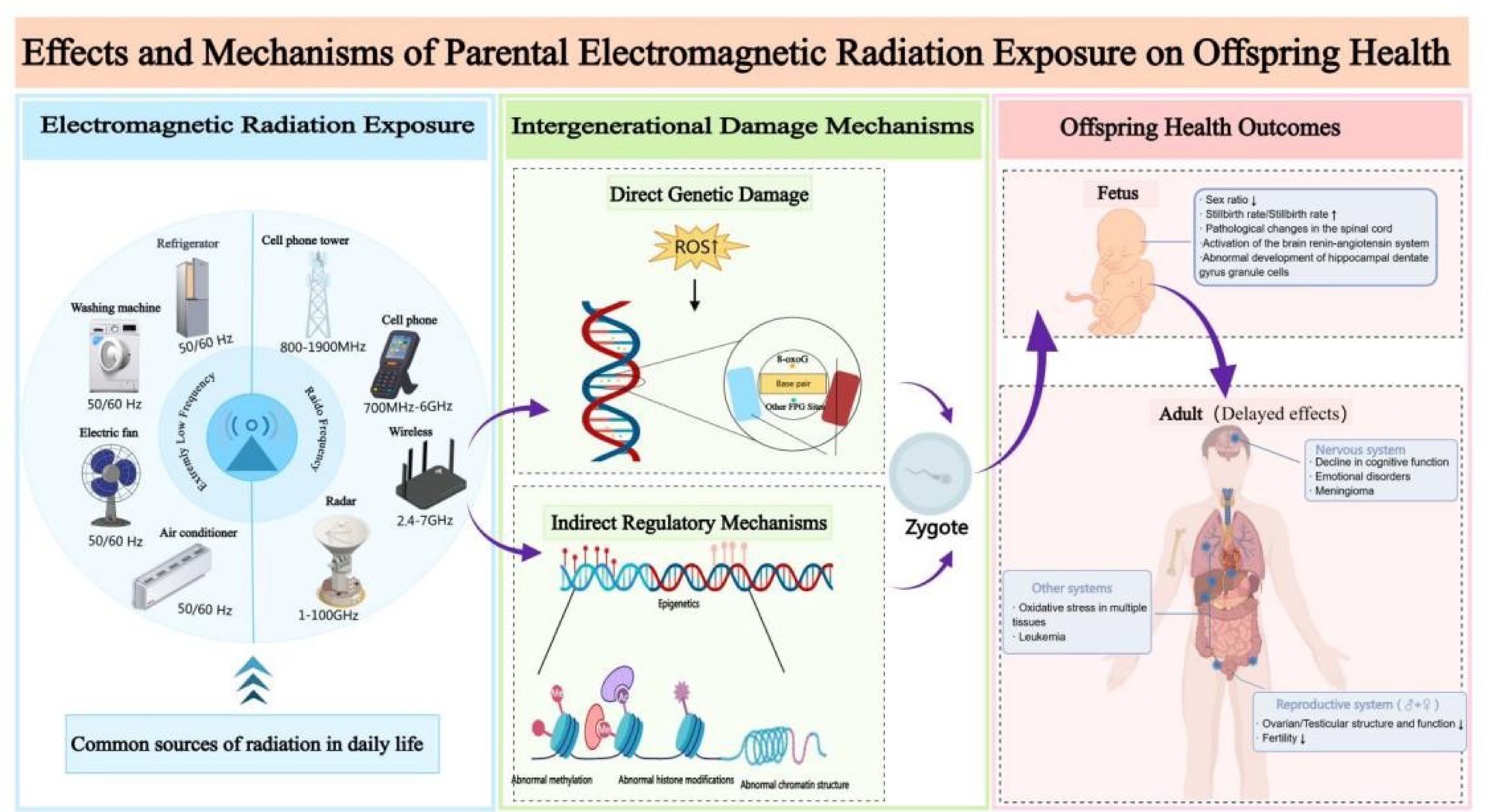 To assess the potential health impacts of long-term exposure to electromagnetic radiation in various populations, the World Health Organization (WHO) convened 300 experts[3] , who identified six priority areas of concern: cancer, heat-related effects, adverse reproductive outcomes, electromagnetic hypersensitivity, cognitive impairment, and oxidative stress. Adverse reproductive outcomes are considered one of the most critical factors influencing human development. During the embryonic development phase, embryos are highly susceptible to environmental influences. Electromagnetic waves can affect the developing embryo, potentially impacting fetal health. Studies have shown[4] that parental environmental exposure is one of the primary factors leading to congenital diseases in children. This review focuses on the health impacts of maternal and paternal electromagnetic radiation (EMR) exposure on offspring, with particular emphasis on underlying biological mechanisms and intergenerational effects. While maternal EMR exposure has been extensively investigated in fetal development research, paternal exposure remains significantly understudied. This asymmetry in scientific attention underscores a critical research gap: the lack of systematic comparisons between maternal and paternal EMR exposure in terms of biological mechanisms, critical sensitive windows, and long-term health outcomes. The present review aims to synthesize findings from epidemiological studies and animal experiments to compare the similarities and differences between maternal and paternal EMR exposure in mechanisms of action, critical exposure windows, and health consequences. Through systematic synthesis and comprehensive analysis, this study seeks to provide a scientific foundation for a holistic understanding of the potential risks posed by parental EMR exposure to offspring health, while offering insights to guide future research directions and inform public health intervention strategies.