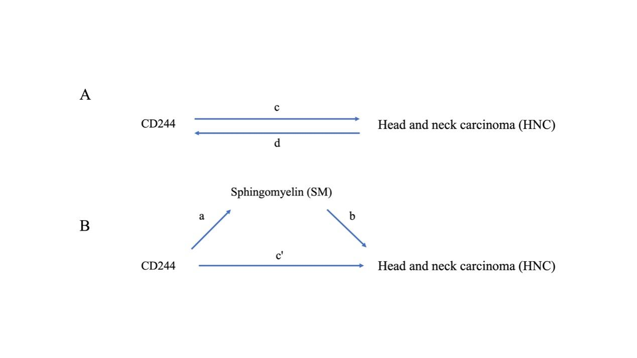 Mendelian Randomization (MR) is a causal inference method that utilizes genetic variation as an instrumental variable to assess the impact of exposure factors on outcomes in observational data. This ensures a relatively low correlation between the exposure variable and other potential confounding factors, thereby enhancing the credibility of causal inference. Simultaneously, MR helps to avoid reverse causality, as genetic variations typically precede exposure factors, reducing the likelihood of reverse causation [16] . The study aims to ascertain whether there is a causal relationship between CD244 and HNC, and to evaluate the extent to which the effects of CD244 on HNC are mediated by sphingomyelin.