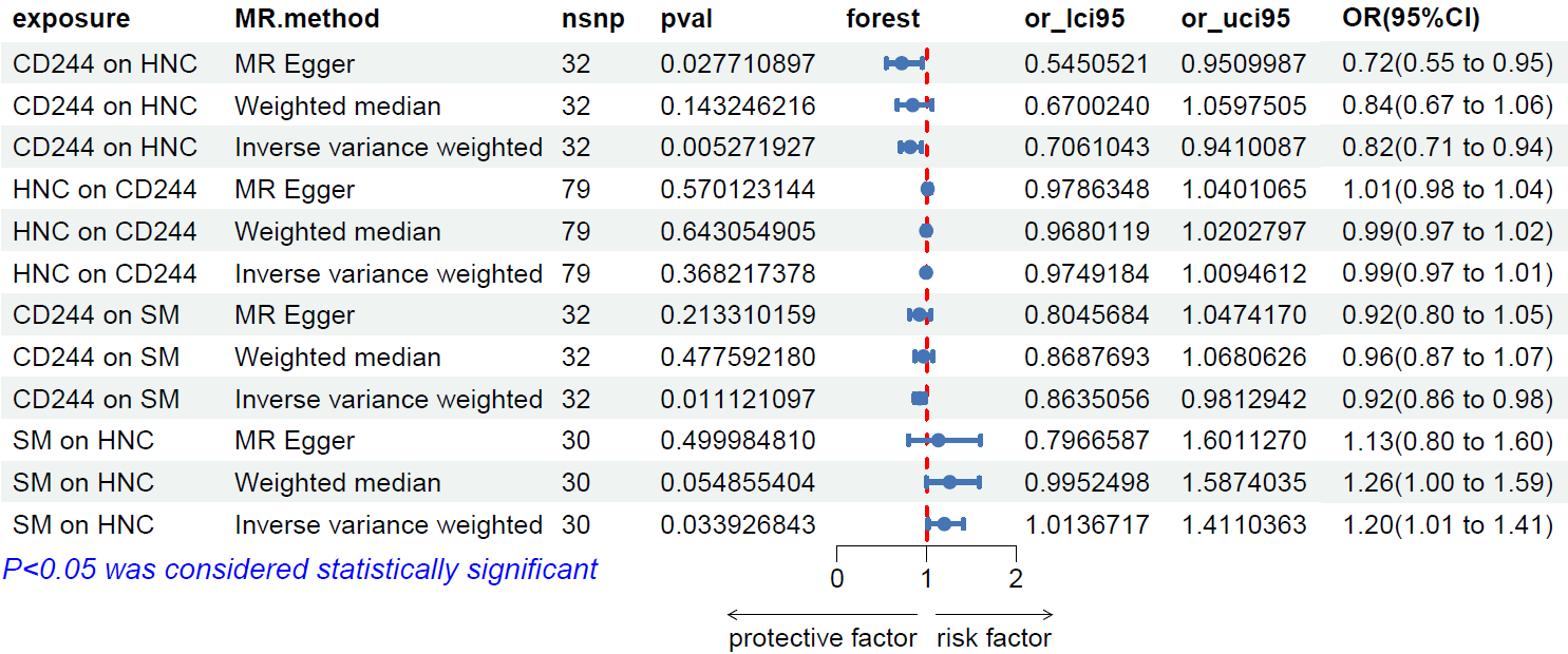 Figure 3 Forest plot to visualize the causal effects of SM with CD244 and HNC.