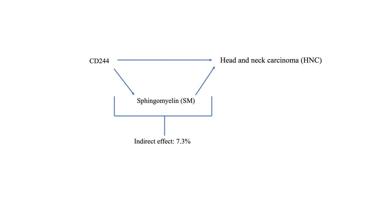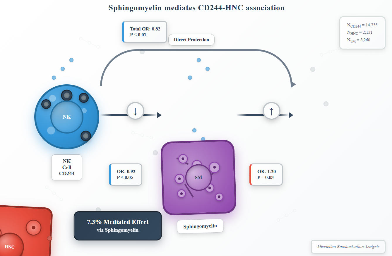Conclusion:This study establishes a causal protective role of CD244 in HNC pathogenesis, partially mediated through SM. The findings highlight CD244 and SM metabolism as potential targets for HNC immunomodulatory therapies. Future research should validate these mechanisms in diverse populations and explore additional mediators.