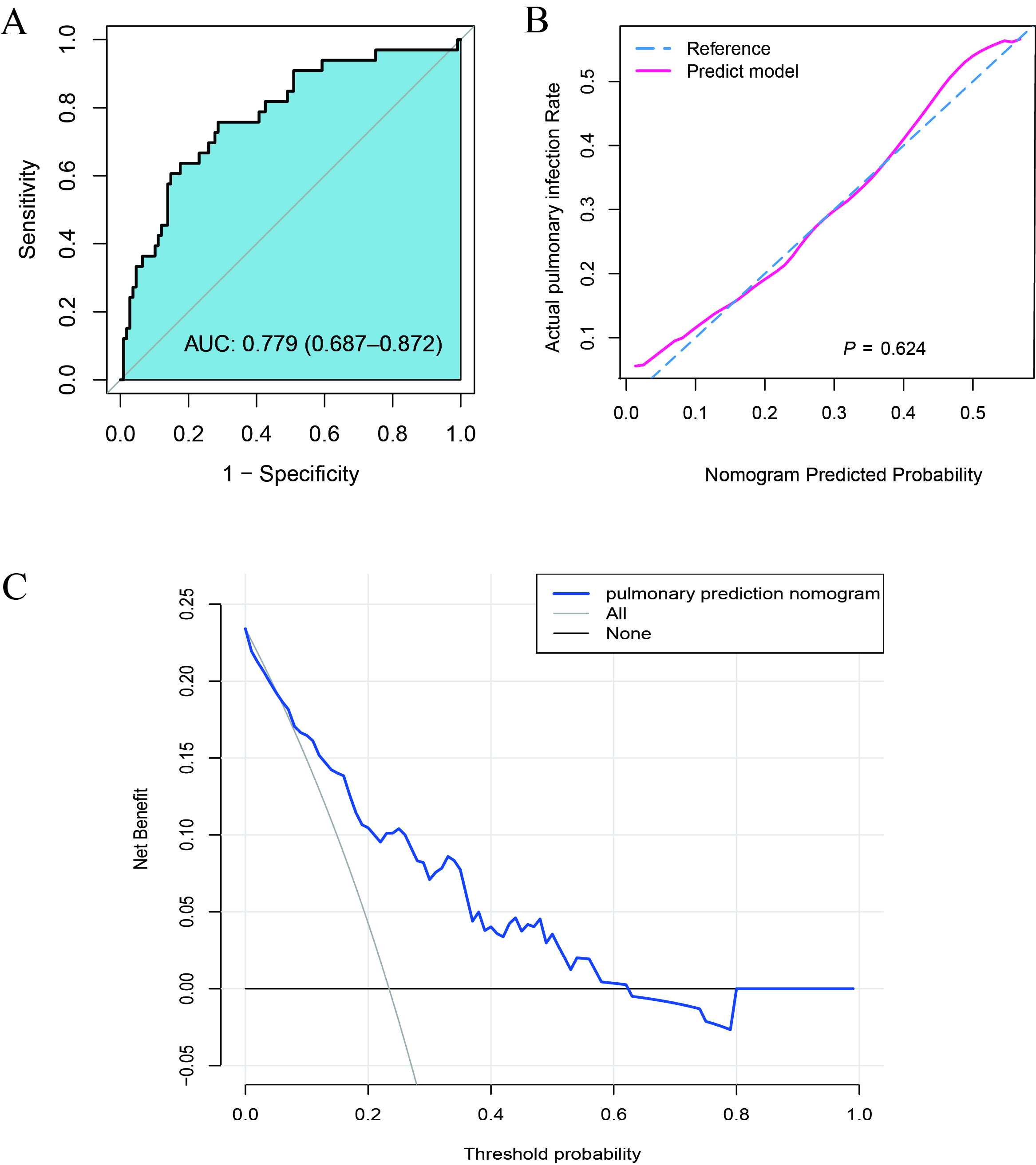 Figure 3. Effectiveness evaluation of the nomogram model. (A) The receiver operating characteristic (ROC) curve of the nomogram of the risk prediction after transplantation. The X-axis and Y-axis reflect the false positive rate and true positive rate of post-transplant morbidity prediction. The AUC value was 0.779. (B) The calibration curve of the CAP-risk prediction nomogram after transplantation. After transplantation, the CAP prediction is represented on the X-axis, while the actual CAP is represented on the Y-axis. The perfect prediction result of the ideal model matches the diagonal dashed line. The nomogram performance is represented by a solid line, and a match closer to the diagonal dashed line indicates a better prediction. (C) For CAP after transplantation, decision curve analysis (DCA) was performed. The Y-axis represents the net income. The CAP risk nomogram after transplantation is indicated by a red line. The thin solid line represents the hypothesis that all recipients could survive after transplantation, while the thick solid line represents the hypothesis that all kidney recipients will suffer CAP after transplantation. The decision curve indicates that the threshold probabilities for patients and doctors are >0.13 and <0.61, respectively. The current study results indicate that the morbidity risk nomogram could be used for post-KT morbidity risk prediction as it is more helpful than intervention-for-all-recipients or no-intervention schemes.