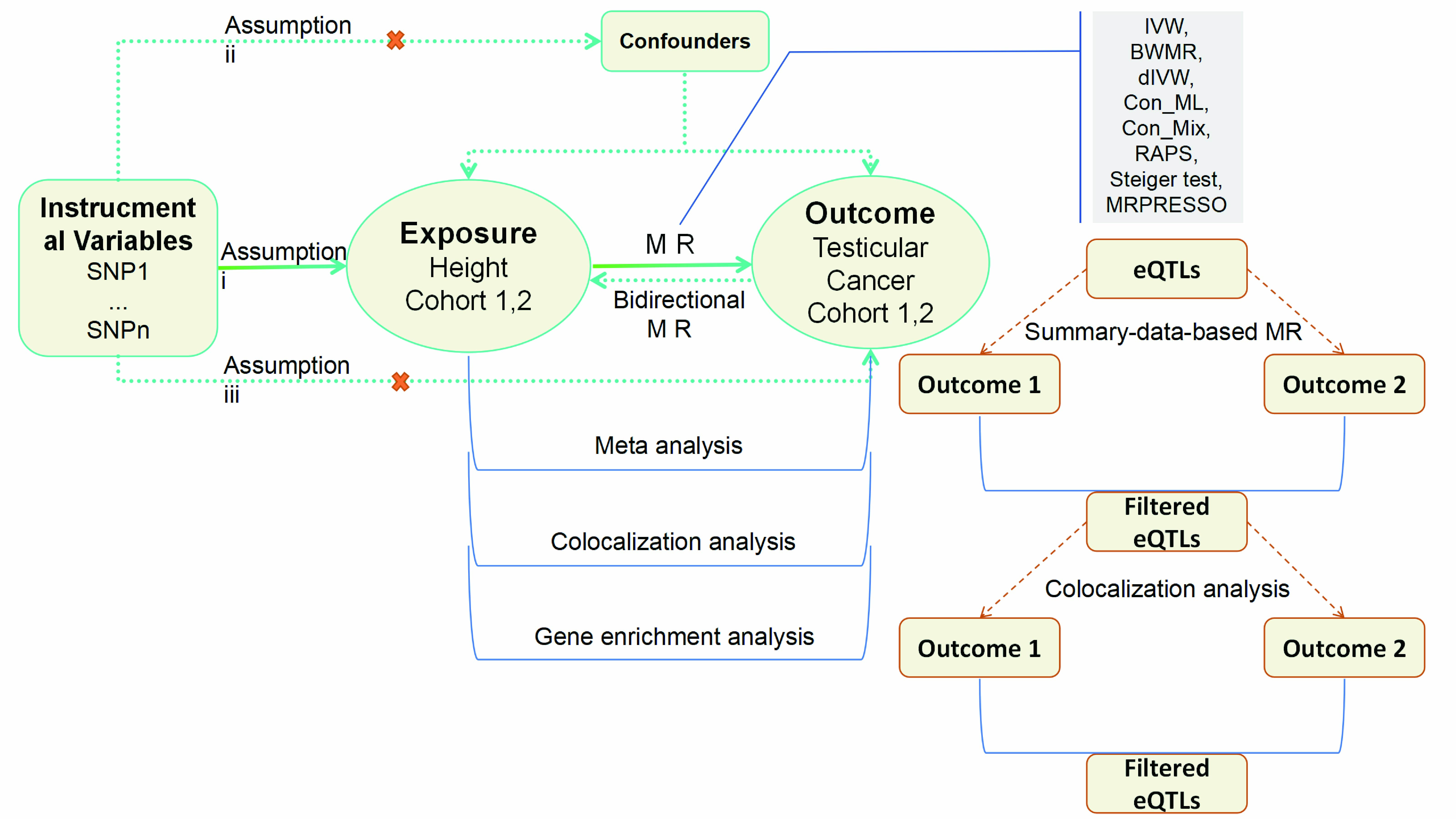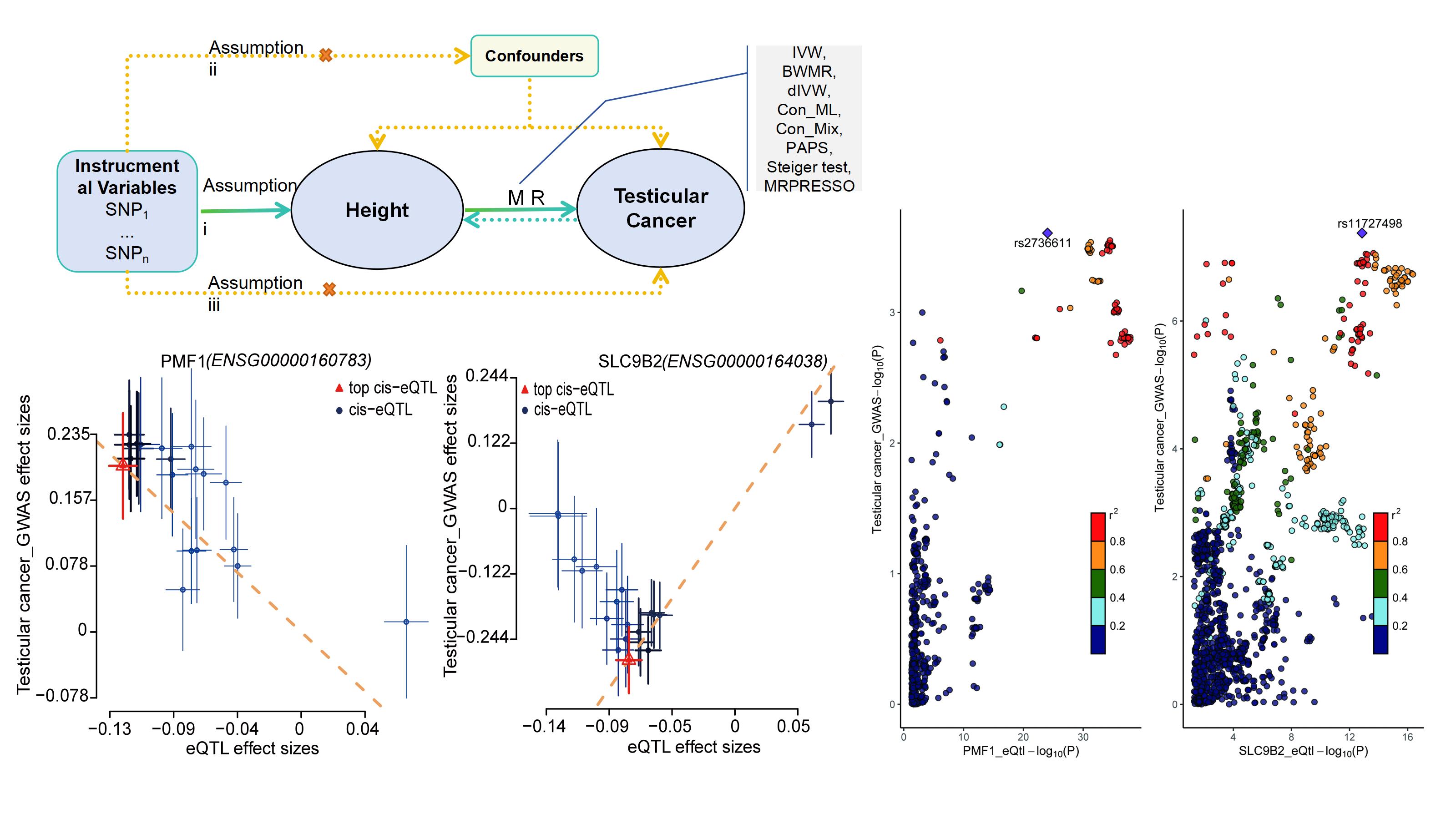 Here, we apply state-of-the-art two-sample MR using extensive GWAS meta-analyses of adult height and TC, aiming to resolve the causal role of height in tumor risk. Concurrently, SMR analysis interrogates GWAS and eQTL summary statistics to identify and prioritize genes whose expression mediates testicular carcinogenesis.