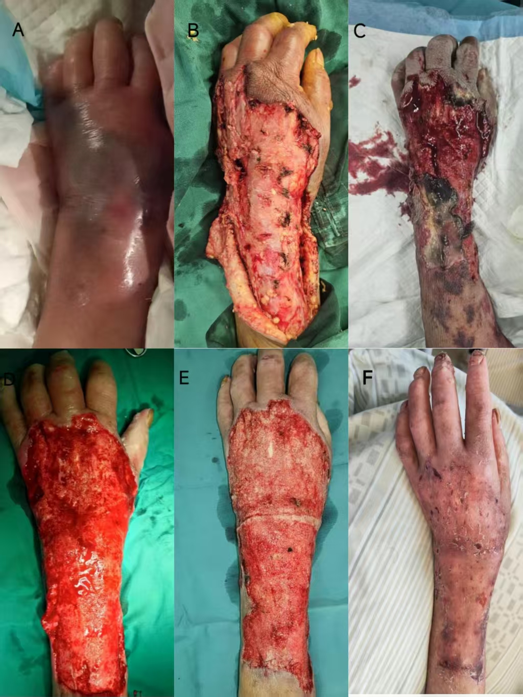 The 58-year-old female patient had a history of rheumatoid arthritis for 20 years. She had been taking tripterygium wirelli for immunosuppressive therapy for a long time. She had a history of right knee fracture surgery and binocular cataract surgery. Nine days earlier, a freshwater fish (Chinese carp) had stabbed the area between the thumb and forefinger of the left hand, and the following day the patient experienced swelling and pain in the affected area. The patient removed the scab on her own and disinfected the wound with iodine povidone, but her condition did not improve and the swelling worsened, increasing to the whole palm and wrist, so she was admitted to the emergency department. On the day of the patient's visit, she presented with severe symptoms of unconsciousness and a drop in blood pressure (62/42 mmHg), with further swelling of the stabbed area. Emergency physicians immediately supplemented blood volume, applied vasoactive drugs and transferred the patient to the intensive care unit. Critical care physicians applied piperacillin-tazobactam for anti-infective treatment and cultured mild Aeromonas sp. in the wound secretions, and continued aggressive rehydration with high doses of vasoactive medications (norepinephrine 160ug/min to maintain blood pressure around 120/70mmHg) to maintain the patient's vital signs. The patient underwent a first emergency surgical debridement on the first day of hospitalization, during which the surgeon incised the affected area for thorough debridement and placed a Vacuum Sealing Drainage (VSD)(Figure1A-B). After the operation, the patient was returned to the intensive care unit, where mechanical ventilation was continued, followed by an anti-infective regimen of meropenem (1gQ8H), vasoactive drugs, gammaglobulin, allogeneic plasma, and albumin to maintain the patient's vital signs. On the 20th day of hospitalization, the patient's vital signs stabilized, and he was extubated and resumed spontaneous respiration. The patient underwent the second, third, and fourth surgeries on the 8th, 19th, and 26th days after hospitalization, respectively(Figure1C-F) . Finally, the patient was discharged from the hospital with a total of 41 days of hospitalization, including 27 days in the intensive care unit.